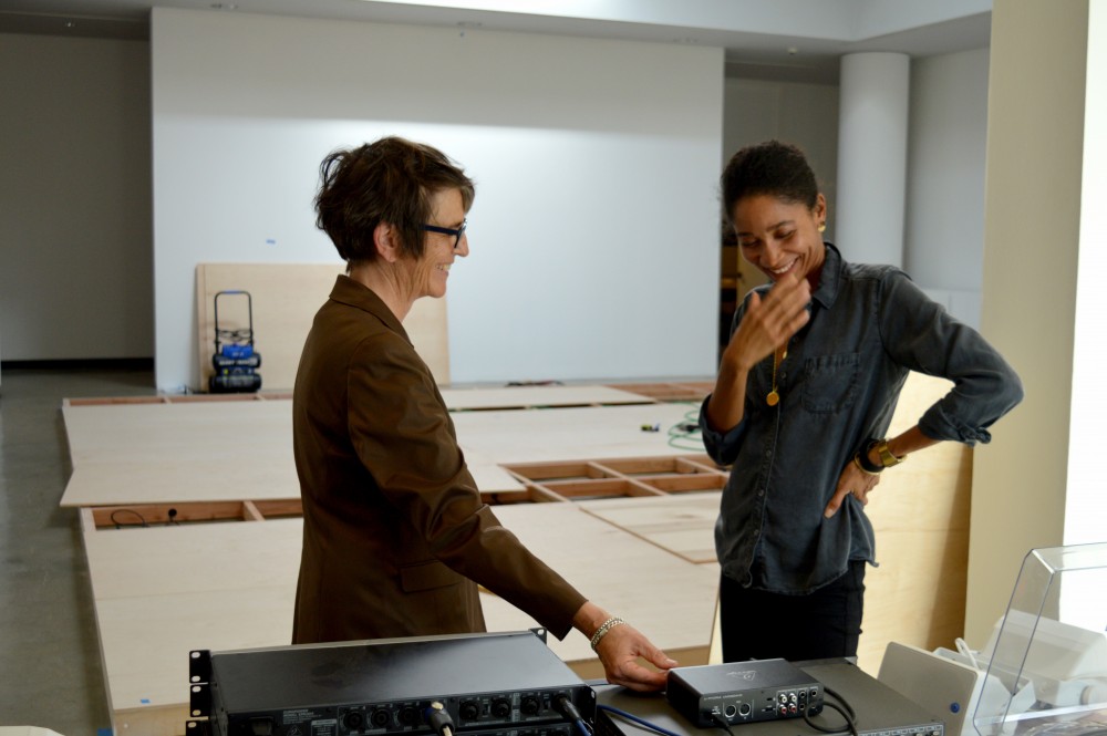 Former Long Beach Museum of Art Director Kimberli Meyer (left) photographed together with the artist lauren woods during the installation of American Monument. Photograph by Emily Rasmussen. © Press-Telegram