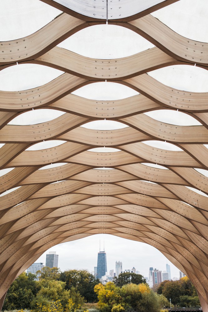 Studio Gang’s Nature Boardwalk at Lincoln Park Zoo (2010) frames a view of Downtown Chicago. Image by David Elliott.