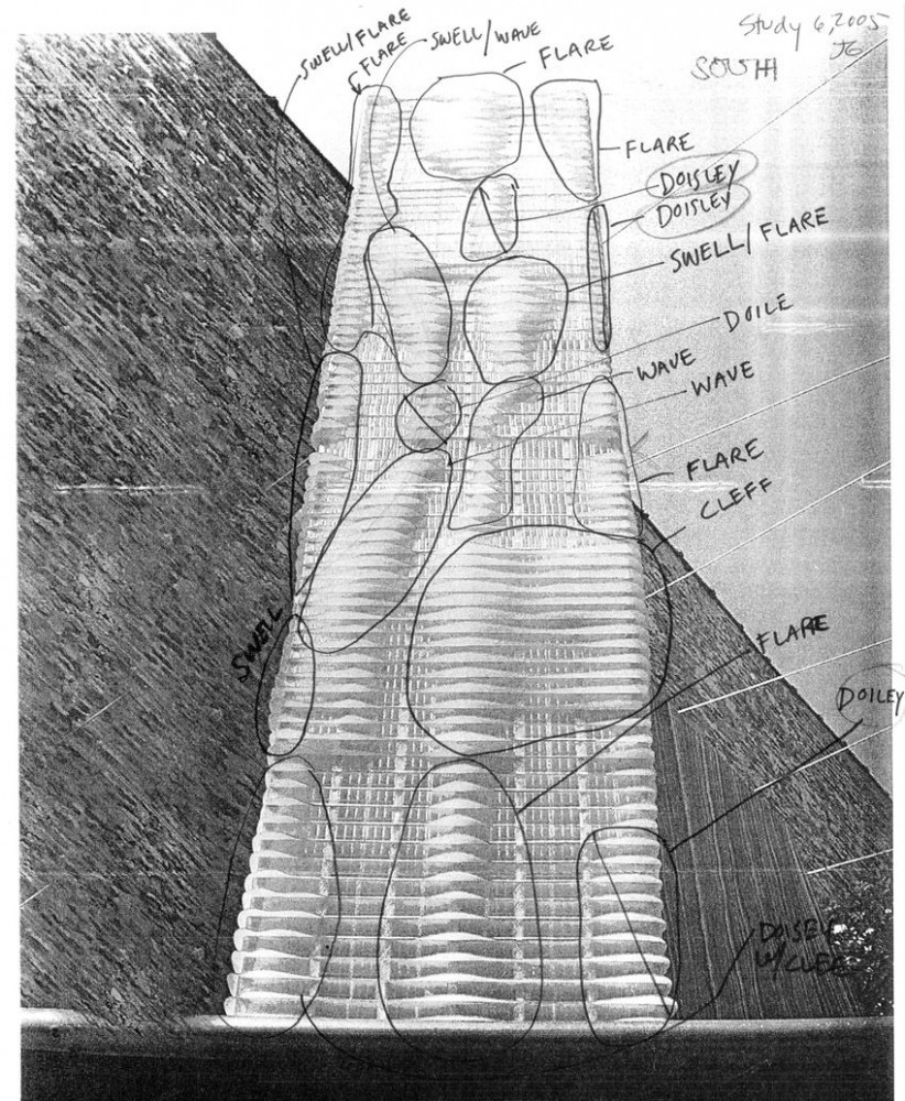 A concept sketch of the Aqua Tower (2010) communicates the emerging formal patterns of the façade. Image by David Elliott.