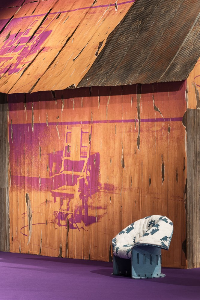There was also the era-defying: Raf Simons commanded a vast royal purple landscape running the length of the fair. For Calvin Klein, fifty renditions of Gaetano Pesce’s Feltri Chair (1986), manufactured by Cassina, have been reissued, each with a unique vintage Amish quilt from the 19th and 20th centuries, sourced from rural American towns. Homespun patterns named “Patriotic Lone Star,” “Chimney Sweep,” and “Bear Mountain Log Cabin” overlay an antique patina onto the iconic chair. Anchoring the homestead is a full-size, freestanding barn made of 19th-century reclaimed wood, originally constructed for the CALVIN KLEIN 205W39NYC Fall 2018/19 runway show. Further twisting the anachronistic thread, the barn’s exterior is papered with a billboard-sized print of Andy Warhol’s Electric Chair (1971).