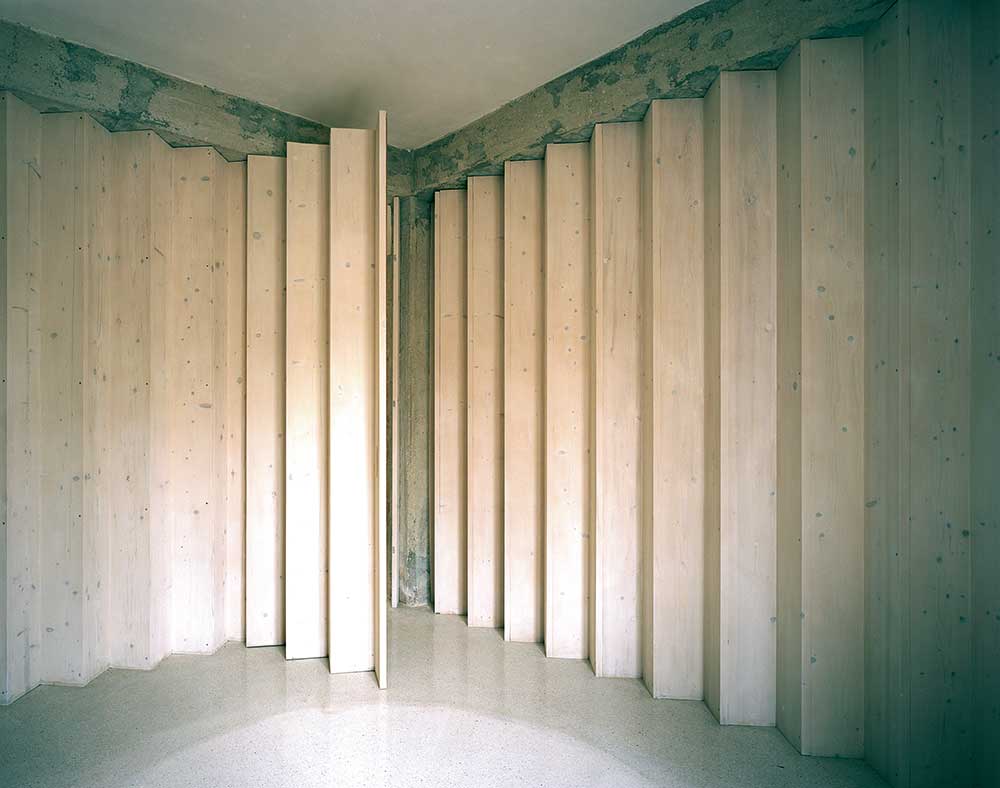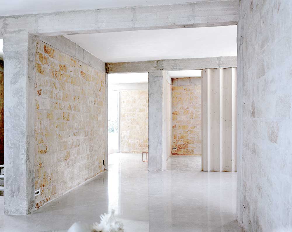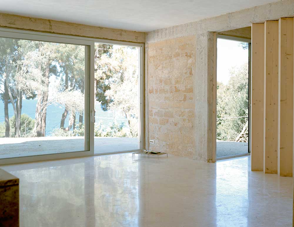 Brandlhuber, together with Giacomo Messina, Martha Michalski, and Marco Wagner, stripped all walls of stucco, revealing blocks of creamy volcanic tuff stone typical in Sicilian construction.
