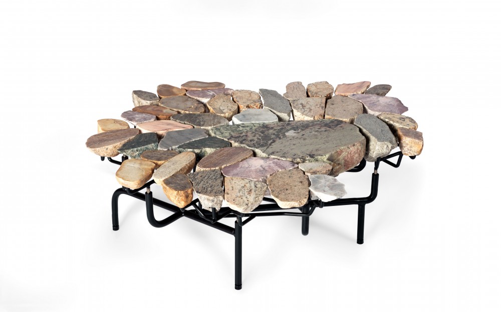 Geology table 2 (2017); Various stones split in half and mounted on steel armatures. Available through The Future Perfect.