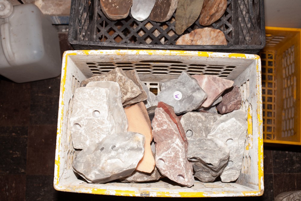 A selection of stone samples, most of them marble from Massachusetts and Maryland, waiting to be transformed. Photo by Sean Santiago.