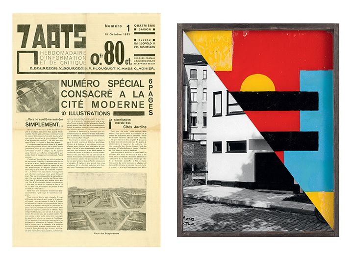 Of course an eclecticism of genres is hardly a new idea, as the exhibition 7 ARTS: Belgian avant-garde, 1922–28, which opened the same week as Collectible at Brussels’s CIVA architecture center, makes abundantly clear. Founded in 1922 by the architect Victor Bourgeois, his poet brother Pierre, and the painter Pierre-Louis Flouquet — who were soon joined by the composer Georges Monier and the painter, engraver, and furniture designer Karel Maes — 7 ARTS was a weekly newspaper that ran for six years, until late 1928, and aimed to cover all seven of the then-recognized arts — including that thrilling new-fangled one, cinema — with a “vast objective” in sight: “ALL THE ARTS. And through them, their penetration in every aspect of individual and collective life,” as Victor Bourgeois wrote in the architecture manifesto he published in the very first edition. The pillars of the seven arts, the two that would allow all the others to be combined, were cinema and architecture: “ART HAS LEFT THE CITY,” the editors proclaimed in the same inaugural issue, “our prodigious urban, industrial, exciting life. It must be brought back. We believe that domestic architecture and cinema will succeed in this.” Although they never used the rather Wagnerian term (too connotated no doubt), they were seeking nothing less than to turn modern life into a gesamkunstwerk in which art, commerce, industry, architecture, urbanism, advertising, music, sport, and just about everything else would form part of a genre-busting whole that abolished any hierarchy between the “decorative” and the “fine” arts. In this aim, they were arguably no different to their Art Nouveau forbears, but their approach was: where Art Nouveau sought to bring nature back into the industrial city in a bourgeois market-economy overkill of curvilinear decorative detail and general fussiness, the 1920s avant-garde sought restraint, asceticism, orthogonality, and rigor, with bold splashes of flat color to brighten up their brave new world. As Victor Bourgeois wrote in his architecture manifesto, “Penury” — the penury of materials in the postwar context — “is the salvation of architecture.”