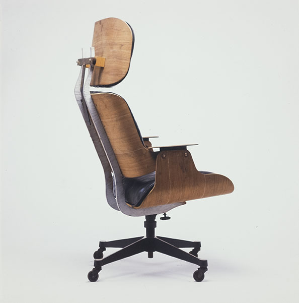 “This is an Eames experimental prototype from the mid to late 1950s that we discovered at the Eames Office. The design resembles Eames 670 lounge chair but more upright, and is evidence of the Eames Office considering the idea of luxurious comfort at the office. This would have been about ten years before Soft Pad, which was launched in 1969. The mainstream acceptance of active sitting and the ergonomic accommodation of work didn’t come about until the 1970s, together with word processing and information management. There was huge growth in the white collar workforce and the daily integration of technology into the office which more than ever required people to be seated in one place.”