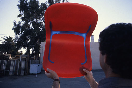Don Chadwick holding experimental Equa shell with filled slot, c. 1981. Courtesy and copyright © Herman Miller Archives.