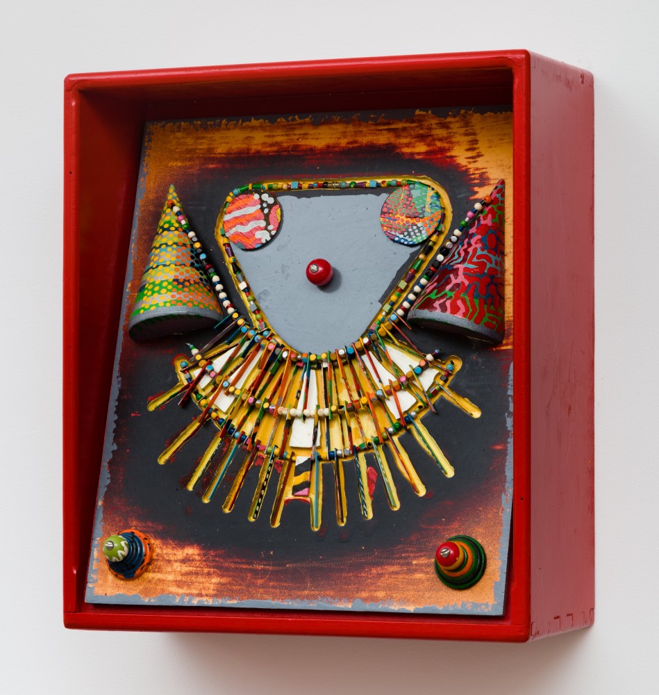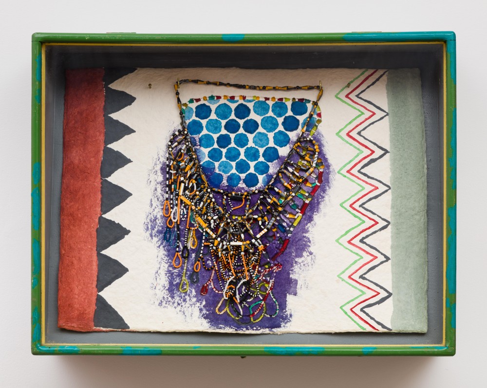 The three pendants included in Object & Thing present an opportunity to experience a little-known side of Alan Shields’ work. Long considered an “artist’s artist,” Shields has recently been reappraised by a broader public, who have fallen hard for his nonchalant manner, which may initially seem wayward and intuitive, but is in fact deeply considered. He had a touch with materials like no other artist of his “post-Minimalist” generation. All these qualities are abundantly present in his necklace pendants, which somehow manage to evoke both the surreal boxes of Joseph Cornell and arcade pinball games. Nor was this just a brief diversion for Shields: he had a space permanently dedicated to beadwork in his studio, and wore necklaces himself his whole life. According to gallerist Dorsey Waxter, “He took pleasure in the idea that there was a dual presentation of his necklaces, either worn or showcased in a box as indicated on the verso of the boxes. He took pride in this kind of simple invention.”