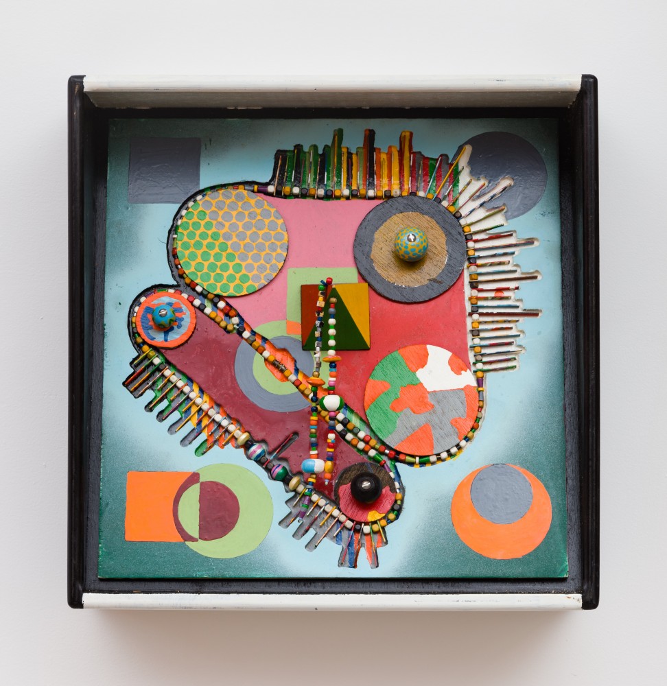 Alan Shields, Clops (1993); Wood beads painted with enamel paint, strung on Dacron fishing line, with artist's painted wood box. Photo by Charles Benton.Courtesy of Van Doren Waxter.