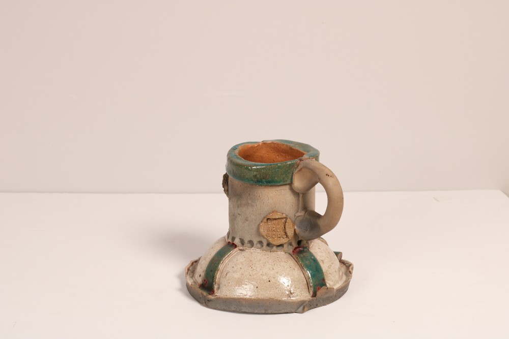 The Californian funk movement in clay was led by the master ironist Robert Arneson, who had many adherents. Some indulged in crass slapstick, but a few had a much finer touch, in tune with the Pop Art currents then swinging from coast to coast. One of these exponents of the style was the Swedish-born Erik Gronborg, who actually developed his style outside of Arneson’s direct influence, first studying with Voulkos and then moving down to San Diego, the other end of the state from the funk epicenter of the Bay Area). This cup is typical of his omnivorous approach to form, showing his interest in Pre-Columbian artifacts.