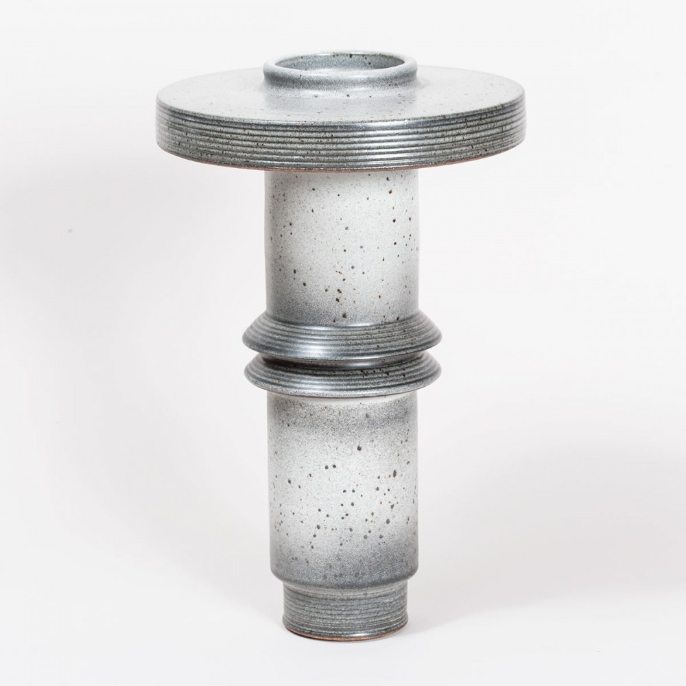 At a moment when many seem to favor sloppy expressionism in ceramics, the cleanly articulated, volumetrically precise work of Ian McDonald is a welcome exception. Currently Artist in Residence in the storied ceramic department at Cranbrook Academy of Art, McDonald works with a repertoire of defined cylinder and disk forms, establishing pulsing rhythms both within each pot and across them as groups. He generally favors a restricted palette, somewhat reminiscent of the digital chiaroscuro seen in 1980s print graphics, with a hint of the subtle tonalities of the Viennese-British potter Lucie Rie.