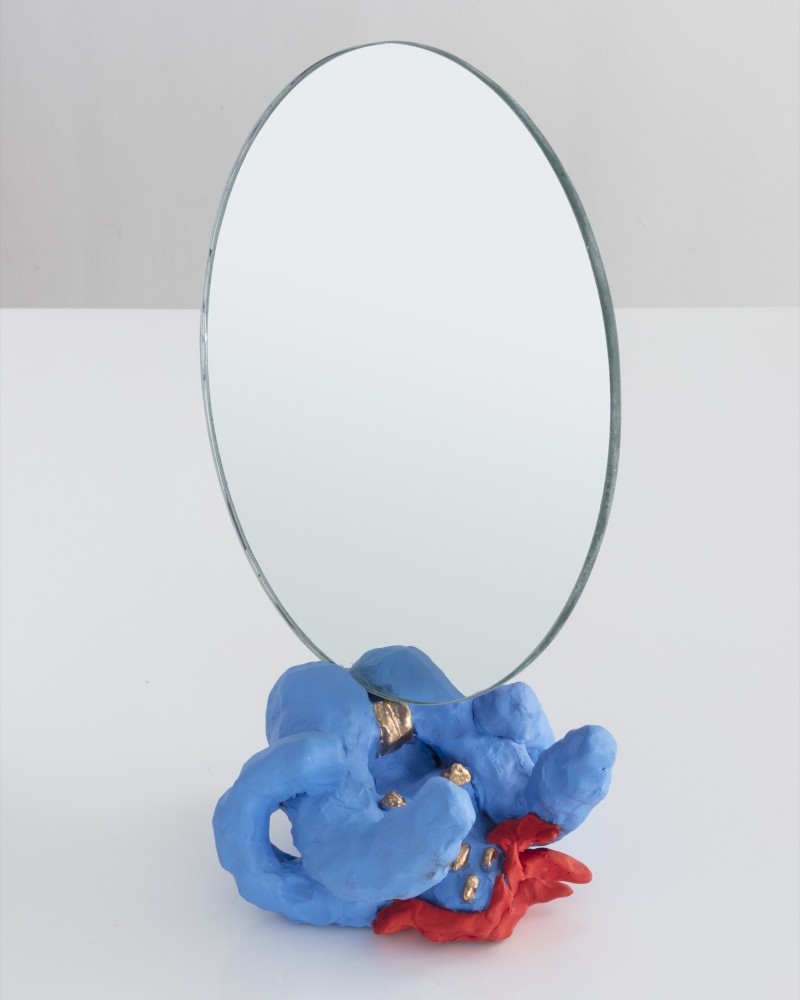 Katie Stout, Girl Mirror (2017); Unique Girl Mirror in painted ceramic. Photo courtesy Joe Kramm/R & Company. Courtesy R & Company.