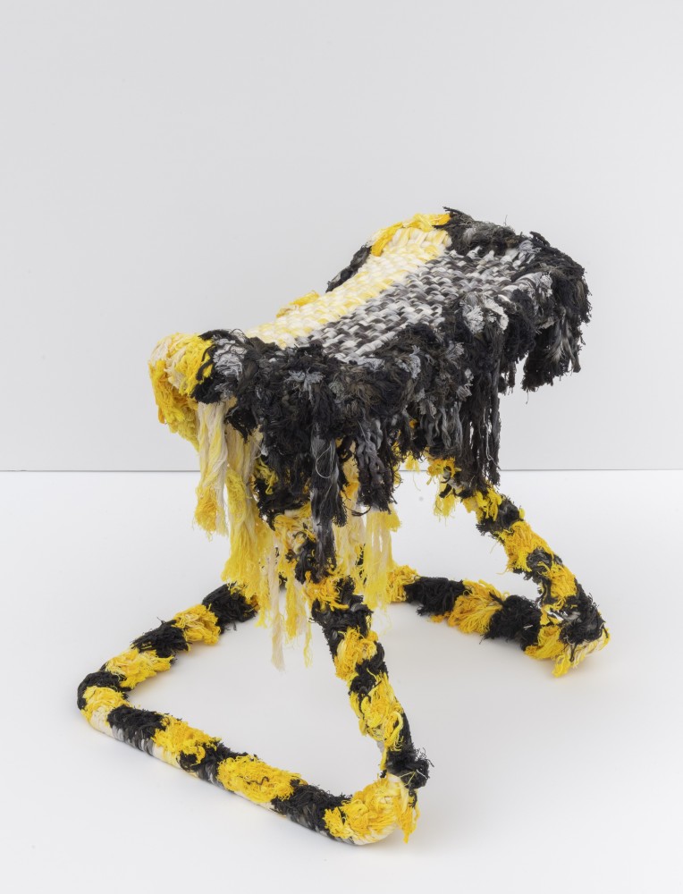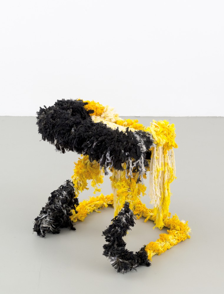 Critic Barry Schwabsky has written of Lucy Dodd’s work that while her methods “allow for a good bit of randomness, the use of that randomness has been carefully thought through.” Dodd brings this same contradictory energy – both chaotic and precise – to her distinctive chairs, made by attaching tufts of pigmented cotton to a metal frame. The tubular understructure inevitably prompts thoughts of modernist designs, like those of Marcel Breuer, but the bright color and soft texture are more like something from the repertoire of Jim Henson. The combination is wacky and charming, yet aggressive, establishing Dodd’s furniture as the equal of her celebrated paintings and installation art.