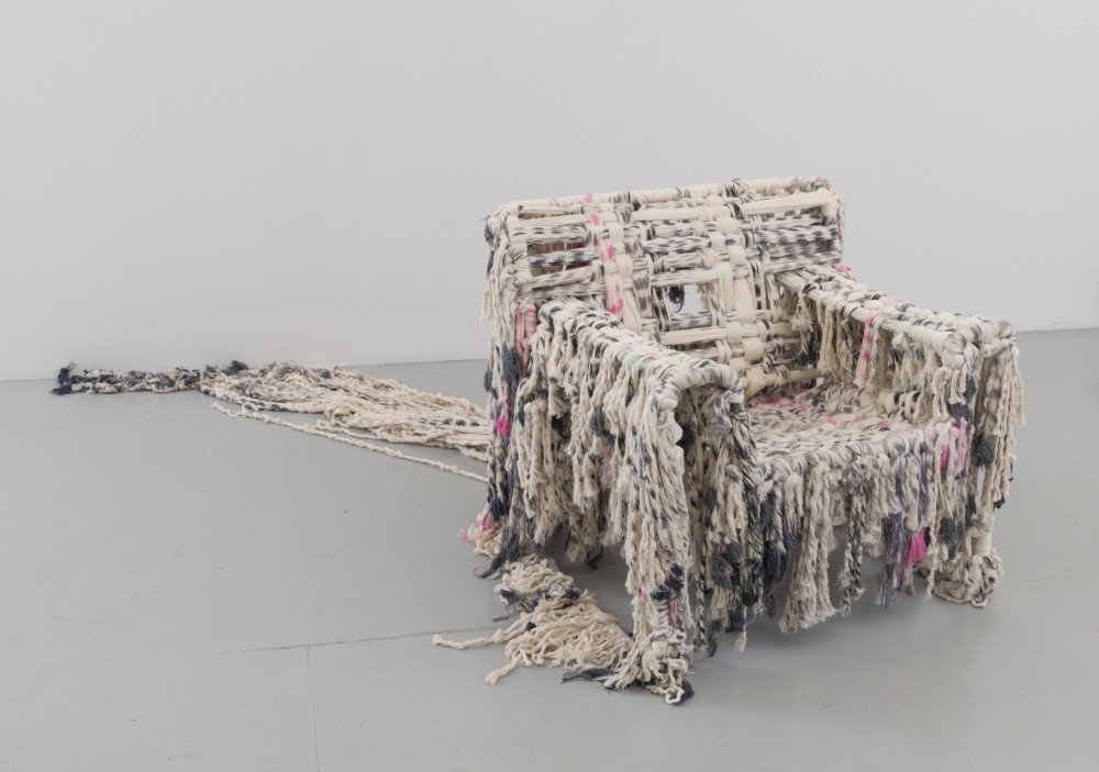 Lucy Dodd, Bzzzzz B (2018); Pigmented cotton on chair frame. Courtesy the Artist and David Lewis, New York.