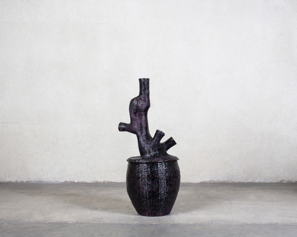 Nearly every designer working today is well aware of impending climate change. Very few are responding in a way commensurate with the scale of the crisis. For Erez Nevi Pana, the most important question for designers today (perhaps the only truly important question) is how to produce objects that are truly sustainable, a principle that has guided all his efforts. This basket exemplifies his approach: Nevi Pana used his own personal trash as an armature for the construction of bamboo baskets. The dark “glaze” is also a waste material, sourced from the Indian cashew nut processing industry.