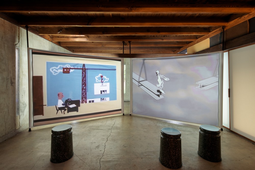 Zeiger’s desire to invite in less common readings of the space came from discovering vestiges of pink paint on the Schindler House walls, and wondering what other stories the house might tell. Pauline and Rudolph separated in 1927 but in an unconventional arrangement, Pauline moved back into the home in the 1930s and painted pink her half of the house (the quarters originally designed for the Chace couple). Zeiger explains that the challenge of installing multiple audio works in the show without aural overlap — including a sound collage by Jorge Otero-Pailos which plays recordings of Merce Cunningham’s rehearsal studios, and an animated diptych video by Pedro Alonso and Hugo Palmarola — made her keenly aware of the house’s architecture too, which “is remarkably resilient” and expressly “designed to allow for distinct spaces.”