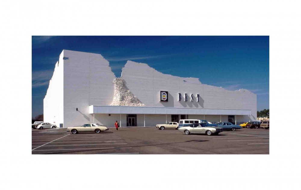 So it was in that small window of opportunity on that one day that WilliWear discovered SITE, who by the turn of the 1980s had earned themselves a high-profile international reputation as the subversive pranksters of architecture. Their radical work for BEST chain stores from 1975 to 1984 achieved something unimaginable, simultaneously functioning as big-box retail outlets and giant conceptual sculptures that critiqued the conventions of the big-box genre. Eleven BEST stores were built in total, each with its own subversive focal point: the 1975 Houston, Texas store, Indeterminate Façade, featured an apocalyptic roofline of crumbling brick; the 1976 Towson, Maryland store, Tilt Building, pivoted the entire façade at a 35-degree angle, forcing customers to walk under the resulting chasm and enter through a hidden glass envelope; and the 1980 Richmond, Virginia, store, Forest Building, was designed to allow nature to grow through its façade. “There was lots of controversy swirling around those stores because they used architecture to comment on itself,” explains James Wines, another SITE co-founder and today the only remaining original member.