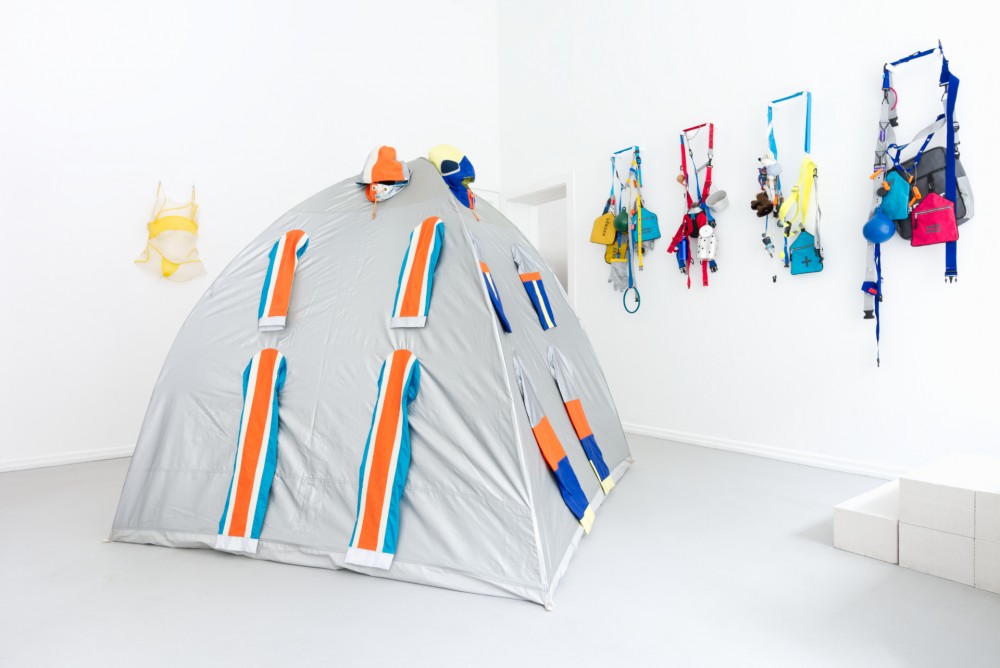 Tent and disaster kits by Lucy + Jorge Orta, part of Wearables at Étage Projects. Photo by Robert Damisch