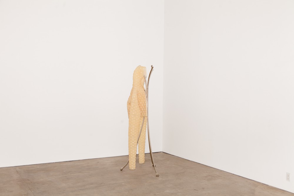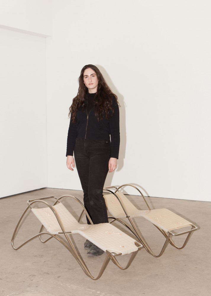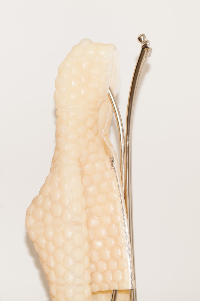 Pearls are a thread throughout the new show. There are several lounge chairs with nickel-plated steel frames and pearl-adorned silicone skins. The loungers are based on a Charlotte Perriand drawing, but Levy has produced them at a three-quarter scale. “It’s kind of the scale of a ten-year-old,” she offers, coding the furniture as decidedly tween before adding, “Scale in sculpture is a way to subtly dip into the uncanny.” Levy has colored the silicone a shimmery beige. “It’s a little bit similar to the flesh of the oysters,” she points out. “And then it’s also a similar color to Caucasian flesh tone.” So-called “neutrals” like beige, taupe, and light pink show up in Levy’s work time and time again. “I think a lot about how specific bodies relate to tasteful interiors and what that means,” she explains. “It’s fucked up, but also the idea of some overweight white guy in khakis sitting on an overstuffed flesh-toned chair, that's the same color and texture as his body, there’s something quietly kinky about that.”