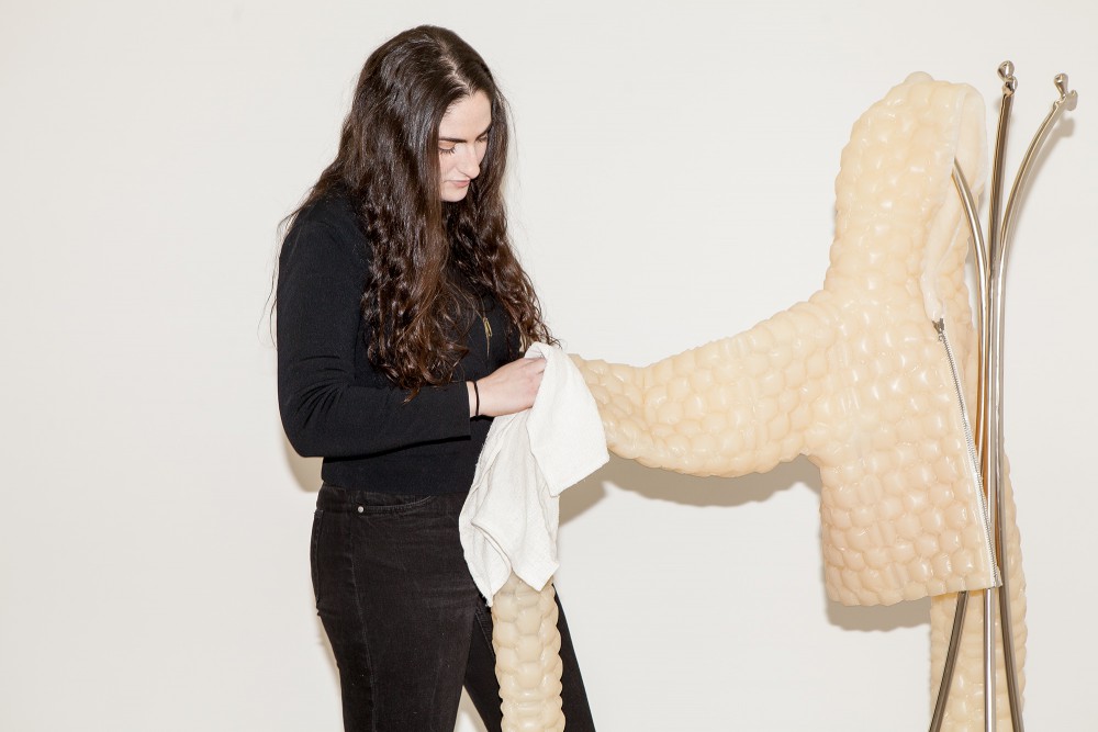 “It’s not a lamp. It’s not a coatrack. It has bone feet,” explains artist Hannah Levy, describing a new piece she’s working on, one that adheres to her signature adaptation of furniture design, referencing several familiar forms at once but recombining them to create something new and totally absurd. Like hyper-designed minimalist home-ware from an alternative dimension or other planet, Levy’s work leaves the viewer scratching their head about the functionality of the object at hand. “It looks like it has some specific use or purpose,” she asserts, “but not one that’s quite placeable.” She’s taken to calling the liminal realm these objects feel destined for “design purgatory.”