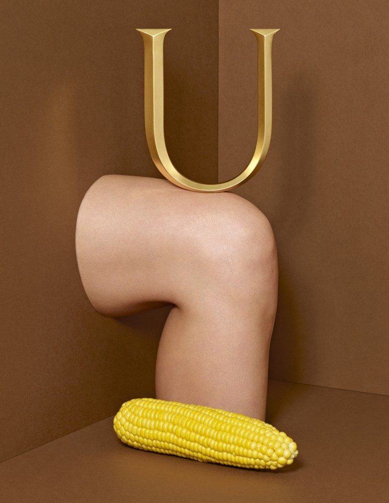 This was one of the first ideas conceptualized. Unlike all the others, only one letter was needed. It’s an absurd, elegant composition. Because it is pushed into a corner I felt it “captures” the “unicorn.” I asked a friend if she would model the “knee” for me and then, one week before the shoot, she had a hit and run with an Uber, and had a broken leg for three months. She hurt her right knee, the one we needed for the shoot, so another friend of mine volunteered to let me shoot her knee. My favorite detail about the image in the end is the small scar on her knee. It was important that it was a woman’s leg. I think of a unicorn as a girl’s fantasy, so I thought it had to be a female-identified leg. The corn is real.
