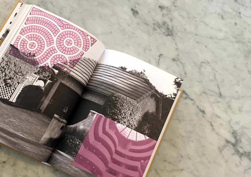 A suburban garage collaged with a sketch of a Joseph Eichler development and a photo pf the interior of the Guggenheim originally designed by Frank Lloyd Wright as a pink concrete car viewing platform.