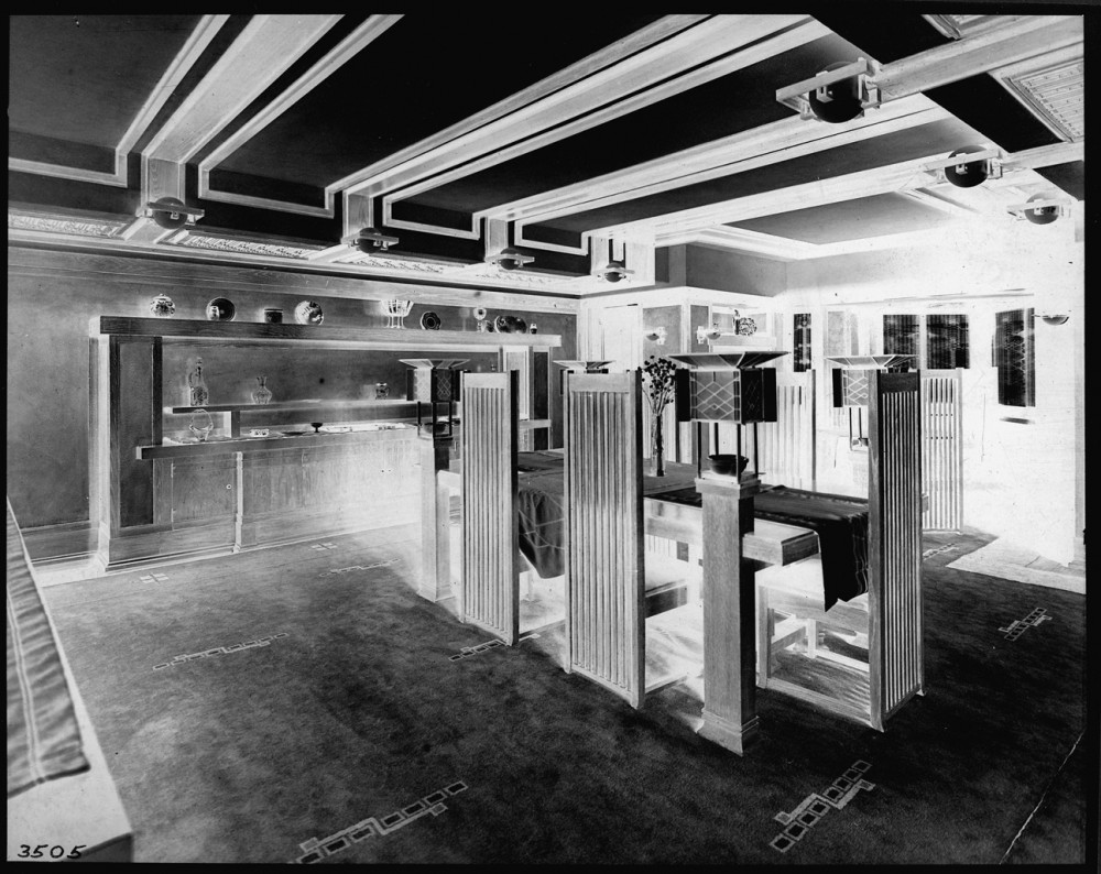 The Robie House dining room with original furniture designed by Frank Lloyd Wright. Credit: Ernst Wasmuth A-G, Photocopy of Plate #115, Frank Lloyd Wright, Ausgefuherte Baute, 1911.