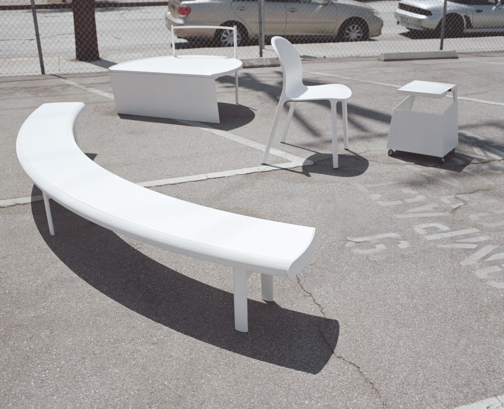 Despite the furniture’s liveliness, the book’s photos, most of them by Zoë Ghertner, retain Olivares’s signature elegance and simplicity, speaking to the inspiration he derives from the clean lines of skate rails, the curvaceous forms of which are still visible in work such as his 2015 adaptable Aluminum Bench, for Zahner. The many possible permutations of the bench also served as the inspiration for a collaboration with the artist Nathan Antolik that resulted in a series of seemingly abstract drawings exhibited at Volume Gallery, Chicago, in 2015.