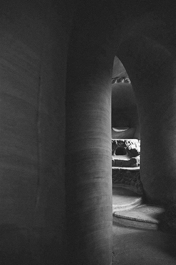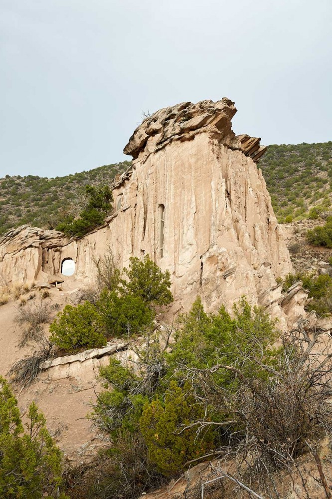 Inanna concludes her prologue and guides our group to the entrance of Windows on the Earth. She fits a key into the lock (yes, the cave has a door) and heads inside. We drop our cell phones in a basket and follow. The interior is surprisingly full of light, sunshine tracing over the sandstone curves while small mirrors set into the stone glitter like pools of water. Paulette considers himself an “intuitive engineer,” so he’s conservative as to what shapes and volumes sandstone can support without reinforcement. But that didn’t stop him from carving large openings through the face of the sandstone cliff. Windows on the Earth offers stunning views across the Ojo Caliente Valley, but it also stirs up internal paradoxes: sky versus stone, man versus nature, past versus future. There’s violence in taking a pickaxe to stone, of carving away at a butte that’s withstood tens of thousands of years, even if it’s in the service of one man’s creative fulfillment. The cave sanctuary is, in many ways, an anthropocentric vanity project designed for human aesthetic enjoyment. Its organic-bunker vibe lacks the critical reflection of 20th-century land art but is too refined to simply chalk up to art brut. Asked about these contradictions, Inanna pauses for a moment, ready to protect her lair, before drawing analogies to the dens dug by coyotes — places of refuge for the desert’s predators. She sighs as if she’s heard the critique before. “Mammals dig,” she explains, “and we are all mammals.”