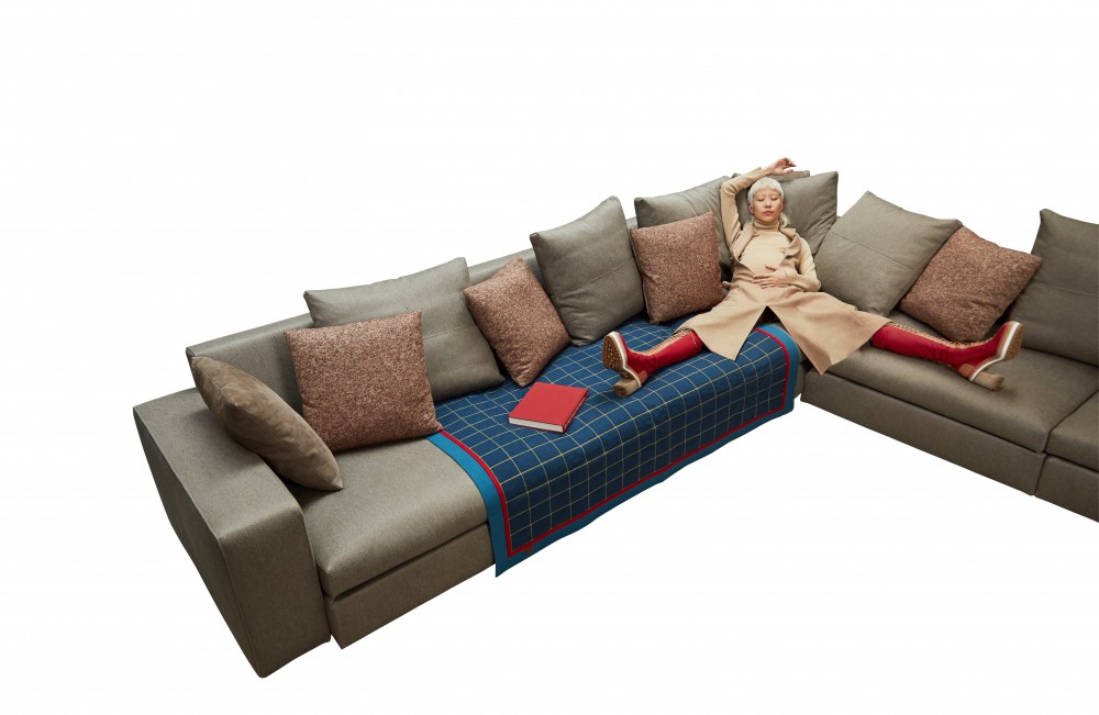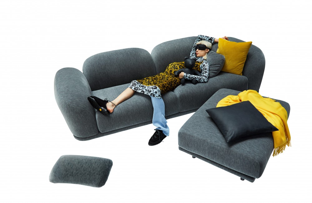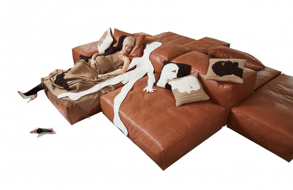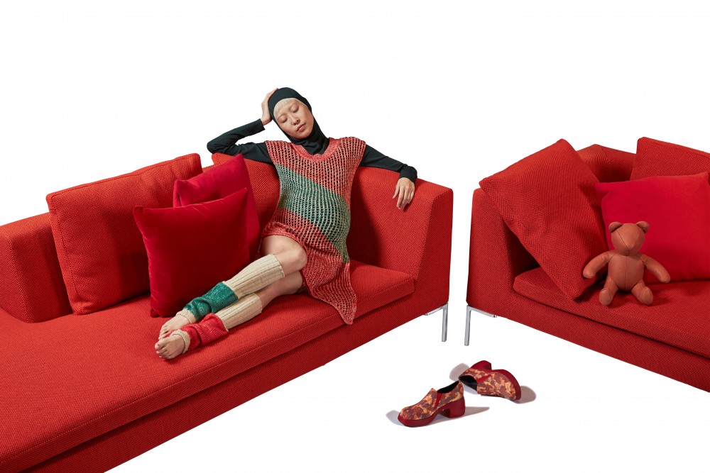 Bump up your nap game by taking some time out on Charles. The modular seating system, an homage to Charles (and Ray) Eames, was designed 20 years ago by Antonio Citterio for the Italian sofa superbrand B&B ITALIA. With their raised base and slender, L-shaped feet, Charles’s three-seat sofas, chaise longues, and corner pieces have lost none of their allure. The Velvet pillow in oxblood red is by CALVIN KLEIN HOME. The red leather bear is from a collaboration between PIN–UP and the design company MAHARAM. Mimi is wearing a hooded top by DION LEE. The crocheted dress and leg warmers are by VIVIENNE WESTWOOD. The shoes are by ECKHAUS LATTA for CAMPER.