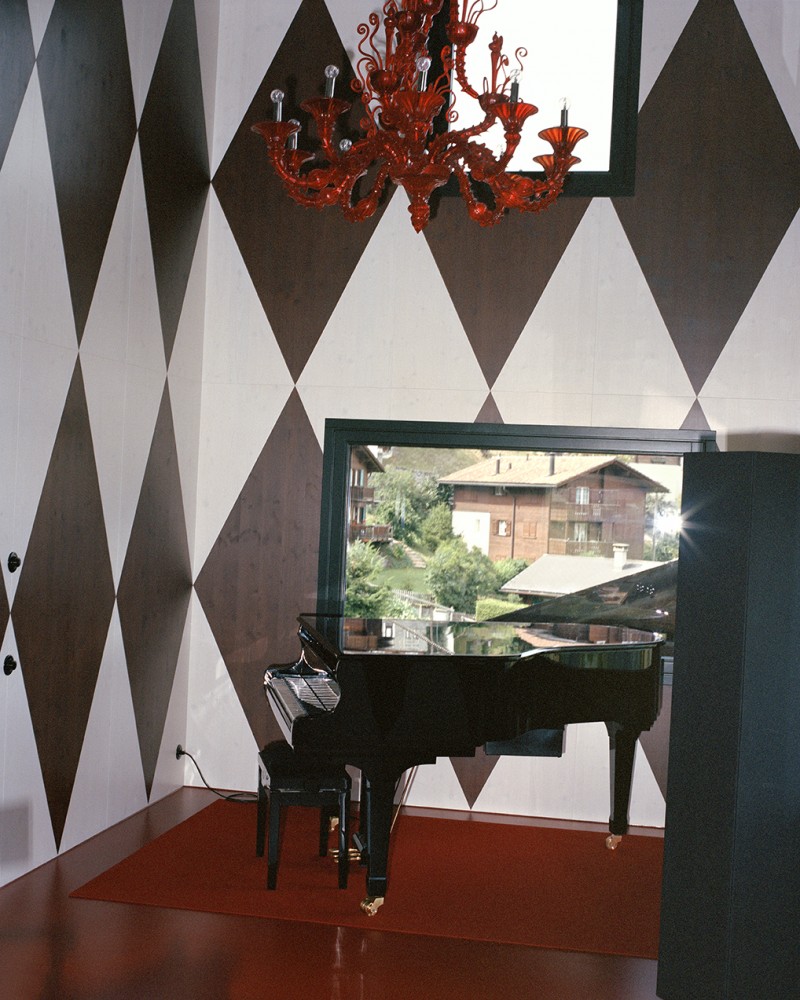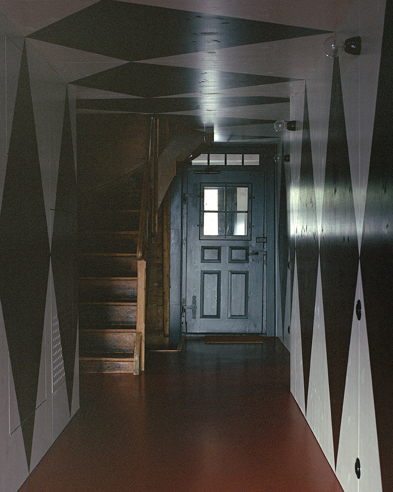 The rhombus-pattern paint job often found on the window shutters of traditional Swiss homes reoccurs, in brown and white, inside the house’s hallways.