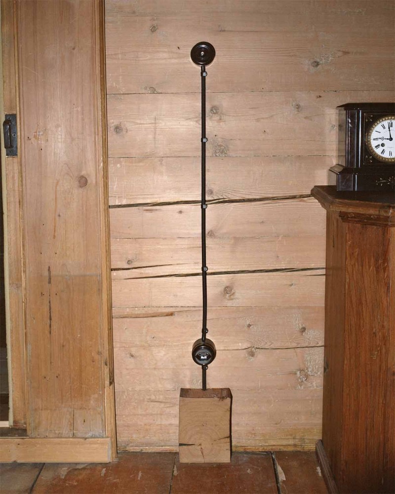 A fun detail throughout the house: electrical wireways covered by a rough-hewn square of wood — usually a no-no in building code.