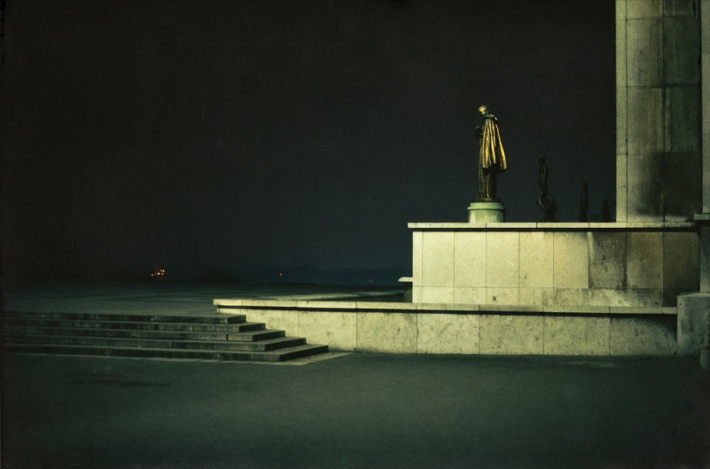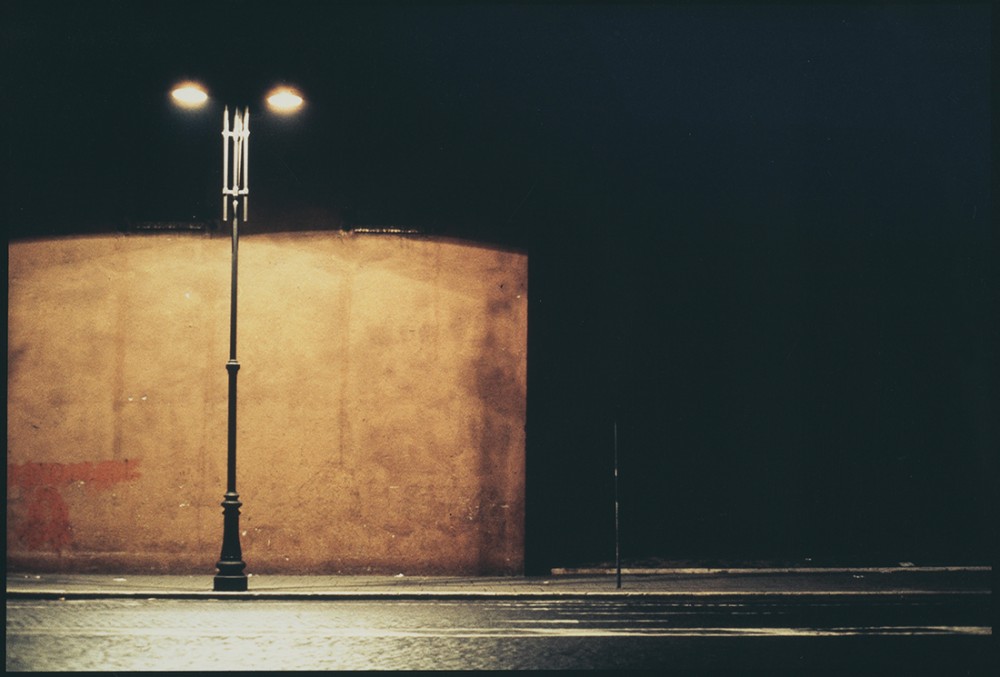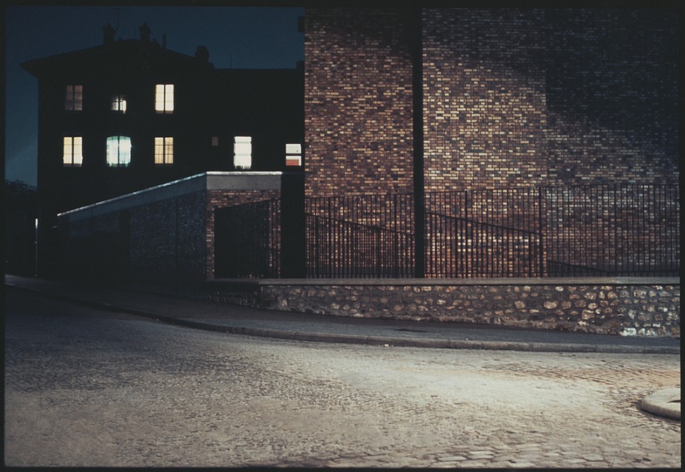 “I think it was in reaction to a certain ‘French’ photography, which characterized a particular era, that of Doisneau and Cartier-Bresson, which was very close to photojournalism,” he later said. This photography of the “instant, especially with respect to human action” was “a trail I no longer needed to follow because it had already been blazed, and even overexploited.” It was in his series of nighttime urban shots, which he began taking in 1973 shortly after publication of Bagdad sur Seine, that Boudinet got entirely rid of people and of the anecdotique in favor of that pure play of architecture under light. But rather than the life-giving sunlight of Le Corbusier’s world vision, it’s the sodium and fluorescence of street lamps that bring to these images their particular quality, to the point where, as Boudinet pointed out, “the blue, green, white, or orange colors produced by these lights play such a role that reproduced in black and white these photos lose their true meaning.” Take for example a view shot in Rome in 1975: the composition is very flat, almost entirely without depth; it is dominated by a giant black L filling two thirds of the frame; in the foreground a cobbled roadway is awash with reflected light; but what draws the viewer in is a large section of bare wall, in front of which stands an elaborate old street light whose sodium glow has turned the wall’s surface into the most extraordinary chromatic poem in orange-tinted yellow. It immediately recalls Proust’s famous pan de mur jaune in Vermeer’s View of Delft, “a little patch of yellow wall … so well painted that it was, if one looked at it by itself, like some priceless specimen of Chinese art, a beauty that was sufficient in itself” (Proust, La Prisonnière). Contrast this with a London shot from 1977: ostensibly it’s a very similar subject, the effect of a street lamp on an urban scene, with yellow stonework brought out in all its splendid detail both on the sidewalk and the wall occupying the middle ground. But here, although the same flattening framing has been used, the image is all about space, manifested through the effects of light — both the pattern cast by the street lamp on the ground but also the shadows that indicate a mysterious receding stairway in the background. Or let’s consider another shot from 1975, this time taken in Paris, as can be understood if you peer into its left-hand corner — that seems to be one leg of the Eiffel Tower catching the glare of the orange night-time haze. But what dominates and brings depth is the concrete foreground, lit by a whiter lamp that has turned it green-blue, and is also making the shadows beneath the background vegetation that much more menacing — or enticing depending on your state of mind. For surely there’s also something of Boudinet’s sexuality in here, these being nothing if not cruising shots where the hunt was double — not only for that perfect image, but also perhaps for the boys one feels must be just outside the frame, round the corner, behind the trees, or obscured in the shadows of those tantalizing steps.