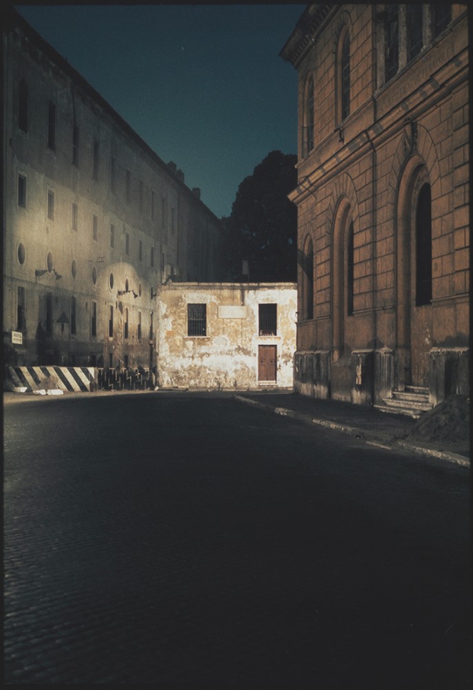Almost a monochrome, the print, like the patch-of-yellow-wall shot, is framed by an L of sky at the top; but here it is the weak white sky of a winter dawn, tinged ever so slightly with pink; the concrete of the tomb, in chromatic contrast, has turned a deep and rather chilly blue, against which the yellows of the mosaic stand out in startling brightness. And again like the Rome shot, the composition is essentially flat, depth only being hinted at by a patch of middle ground to the right. Reproductions of this photograph, or of any of Boudinet’s nighttime series, can be misleading, not only because the color matching is frequently off but because they distort the scale of the original. Working in a pre-digital age, Boudinet produced objects, not pixels, in this case, Cibachrome prints. A now obsolete technique, Cibachrome is a dye-destruction positive-to-positive photographic process used for the reproduction of transparencies; polyester-based photographic paper is covered with 13 layers of richly colored, highly stable dyes, which are bleached off in processing to achieve the final image. It takes skilled technicians to achieve a good result, and photographers often developed close relationships with their developers, as Boudinet must have done with his. Nothing, therefore, beats seeing the original prints, which Boudinet kept deliberately small (12 x 17.5 centimeters for the Rome shot, for example (4.75 x 6.89 inches)), so that the viewer is forced to peer into them, rather in the way that one squints into the jeweled colors of 16th-century miniatures. Where his black-and-white work was concerned (Boudinet switched between the two throughout his career), he would, like most photographers, print the negatives himself. Despite the absence of color, the results appear highly chromatic in their palette of every imaginable type of gray, as evidenced, for example, by his 1985 shot of a building in Calmaggiore, Italy, by Afra and Tobia Scarpa (another Duboÿ commission) or his atmospheric series of the gardens at Bomarzo, which was published in eponymous book form in 1977.