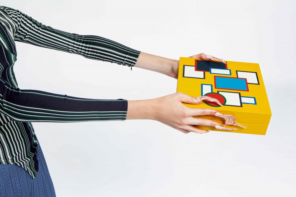 The elves stow their loot in Fenêtres sur ciel, a hand-painted lacquered box designed by Gianpaolo Pagni for HERMÈS. David’s zip-sleeve top is also available through HERMÈS. All nails in the story were created by Juan Alvear.