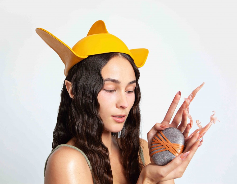 Tenille crowns herself queen of the studio in a mango-yellow leather Wings hat by LOEWE. In her hands she’s cradling a stone that’s been artfully wrapped in leather strings, a collaboration between LOEWE and the California-based mother-daughter design duo Shinzo Studio. Tenille’s wool bra is by BARRAGÁN.