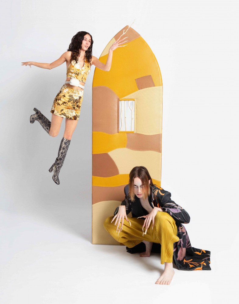 Why work for fairies when you can be your own boss? David is ready to take a stand holding a portable Parrot light, designed by Timon and Melchior Grau for TOBIAS GRAU. Tenille is biding her time against the Aengus chair in pleated baby-blue organza, which was designed by SAM STEWART and is available through Fort Gansevoort, New York. Tenille and David are both wearing outfits by COURRÈGES. Their sheepskin mules and loafers are by UGG X ECKHAUS LATTA.