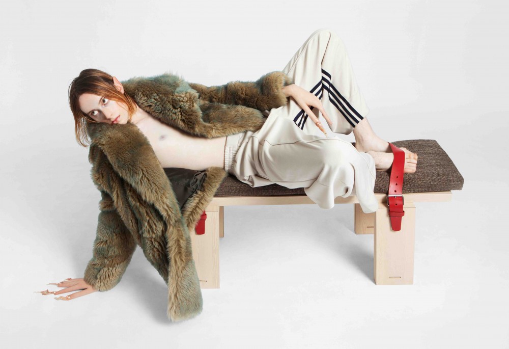 Did someone say big bad elf? David shows off his cropped-shawl sheepskin fur by UGG X ECKHAUS LATTA while strapped to Stacked, a stackable new bench designed by Shawn Maximo for TORTUGA LIVING. His pants are by Y–3.