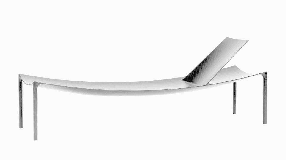 “Karbon transmits an otherworldly aura, appearing to sag under the weight of an invisible body. The surface is so thin that one imagines it might bend further upon use, though the appearance of flexibility contrasts with its disregard for traditional ergonomics. It looks both uncomfortable and elastic at the same time. The vertical legs reveal the rigid nature of the carbon fiber, a material that allows for a thin profile and extremely stiff structure.”