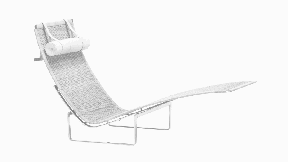 “Wicker has been used since ancient times to produce baskets and furniture. The PK24 combines wicker with exposed stainless-steel connections and a thin profile to form a decadent chaise longue. The stroke of genius is in the adjustable headrest, stabilized by a single stainless-steel bar. Its suspended weight suggests a polished weapon hung on display, visually balancing the cantilevered footrest.”