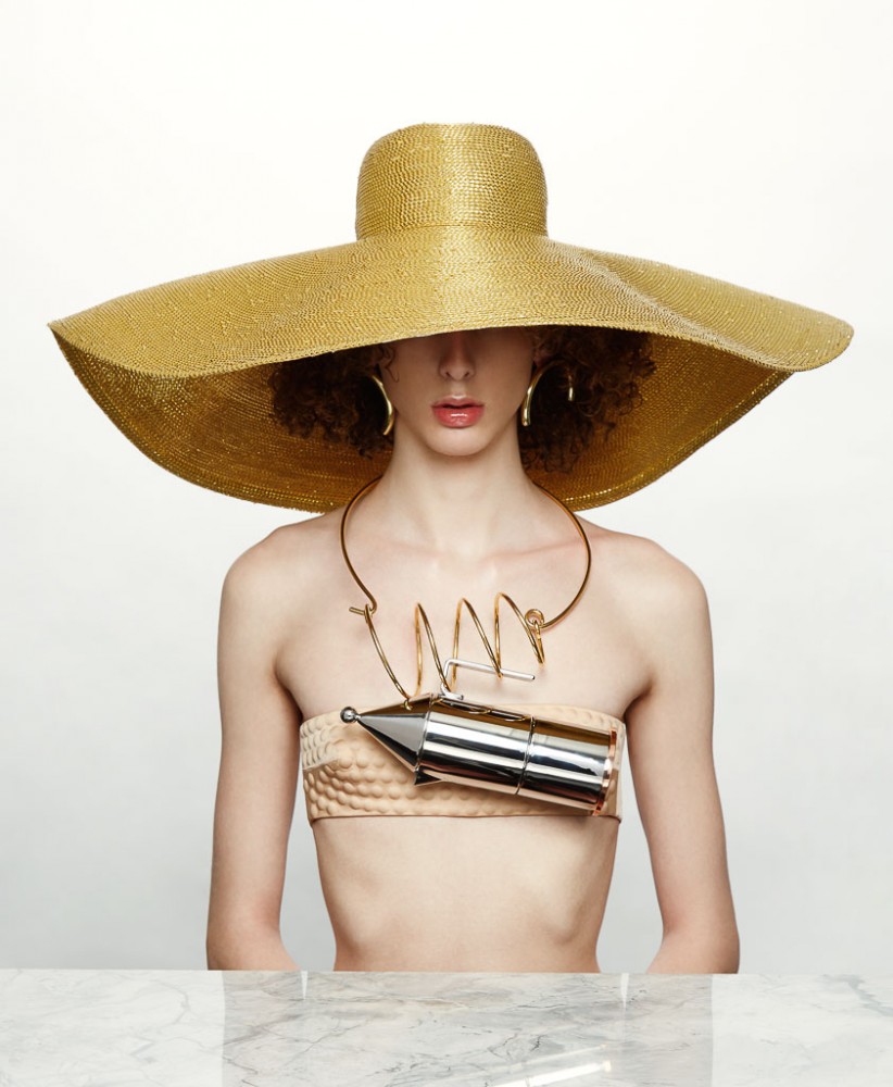 Born with a silver spoon in your mouth? Try going through life with a coffee maker around your neck. Nat paired her EDGAR MOSA necklace with the iconic La Conica espresso coffee maker designed in the 1980s by architect Aldo Rossi for ALESSI. Nat’s earrings are by GEORGINA TREVIÑO, the bandeau top by BEVZA, and her hat by ERIC JAVITS.