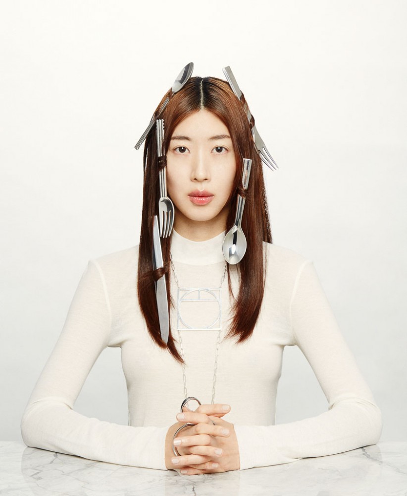 Jiyoung braided some of France’s finest silverware into her hair, including a Nantes fork and dessert spoon, both silver-plated, and a Zermatt fork, knife, and dessert spoon, all made of stainless steel. All silverware is by PUIFORCAT. Around her neck Jiyoung is wearing a sterling silver Chaîne d'ancre Game necklace by HERMÈS. In her hand she’s holding the Voile spaghetti measure designed by LPWK and Paolo Gerosa for ALESSI’s Objets Bijoux collection.