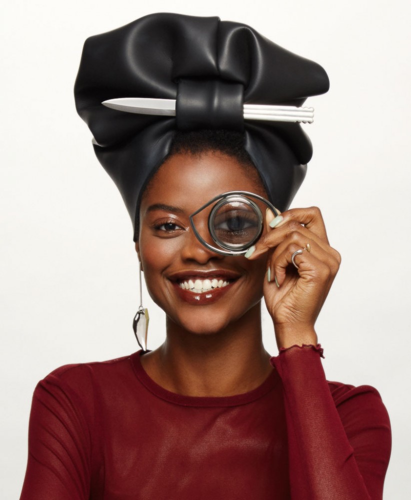 Wemi is serving serveware... on her head! A Nantes table knife by PUIFORCAT adorns a pleather hat by GRAHAM TYLER. The Œil magnifying glass is by HERMÈS. The earring is by CLOSER BY WWAKE, the rings are KOTA OKUDA, and the top by PRISCAVERA.