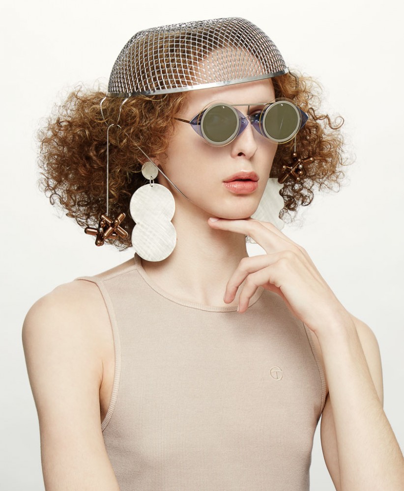 Nat is wearing the AC04 colander, designed by Achille Castiglioni, held in place by a decorative Tripod trivet on a chain designed by Gabriele Chiave. Both are produced by ALESSI. Nat’s earrings are by GEORGINA TREVIÑO and the sunglasses are a collaboration between the Dutch design powerhouse MOOOI and GENTLE MONSTER. The top is by TELFAR.