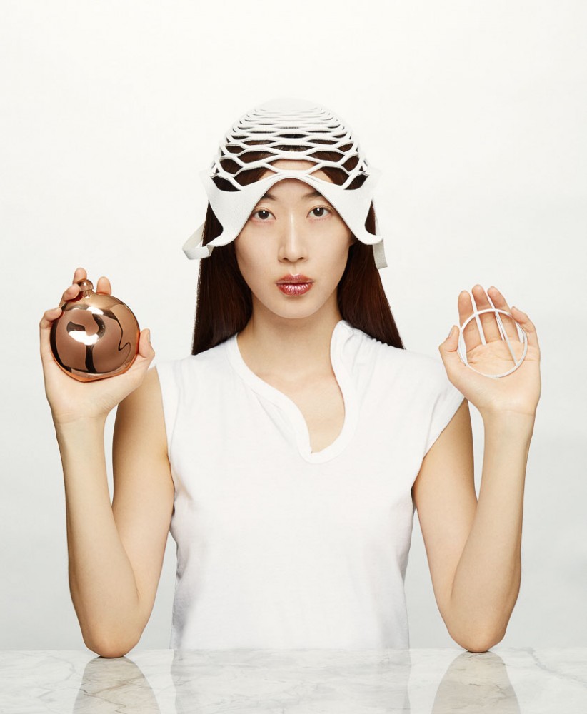 Meanwhile, for Jiyoung the season’s essential bowl cut involves an actual bowl. The one she’s wearing is a limited edition dark copper version of ALESSI’s AC04 fruit bowl, designed by Achille Castiglioni. Always at her fingertips: the Chestnut pill box by Gabriele Chiave and Lorenza Bozzoli for the Objets Bijoux collection by ALESSI. Infinity glasses by MOOOI for GENTLE MONSTER. The bracelet is from the Chaîne d'ancre Game collection by HERMÈS, the necklace is by ONE SIX FIVE, the ring by KOTA OKUDA, the earrings are by SARAH RACHEL BROWN. The dress is vintage COMME DES GARÇONS (via James Veloria).