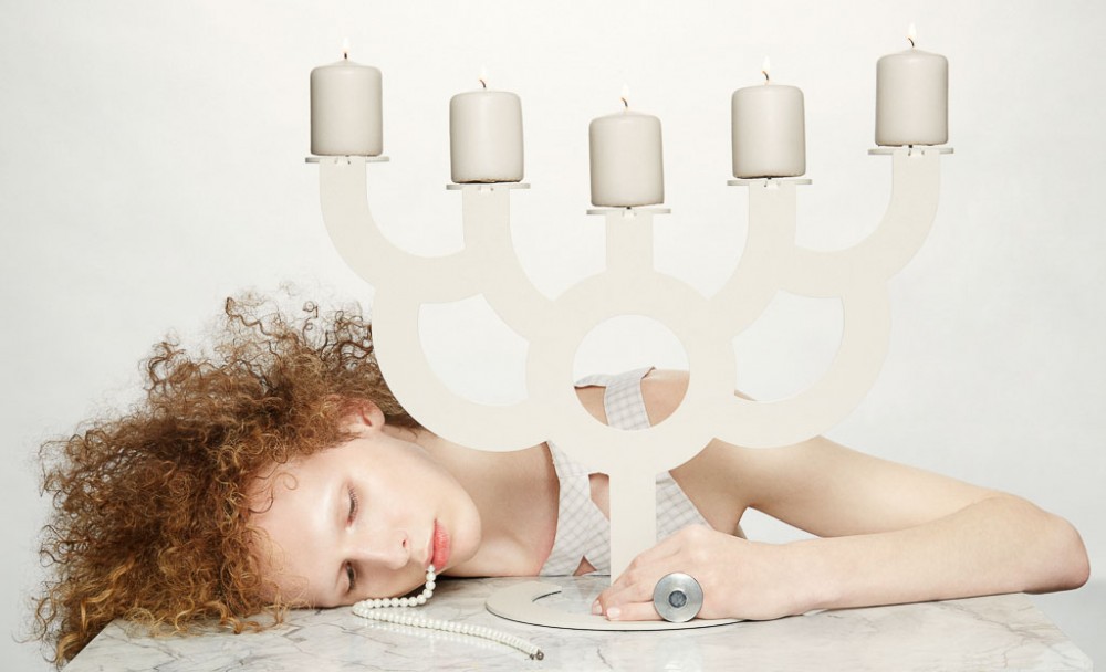 Sometimes the best night out can’t hold a candle to a good night’s sleep. Resting behind the candelabra, Nat is wearing a shirt by CFGNY, a strand of interconnecting pearl earrings by SLOW AND STEADY WINS THE RACE, and a classic sink stopper as a ring. The five-prong Little Bold candelabra is a design by Dutch designer Roderick Vos for MOOOI.