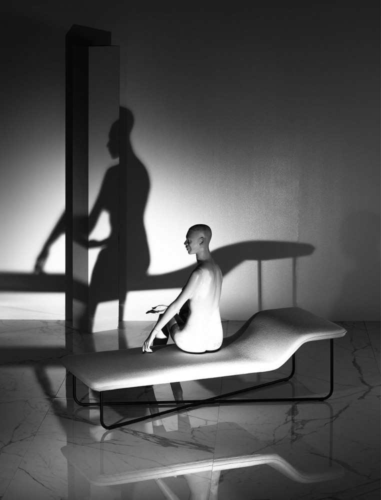 Keiji Takeuchi, Clivio chaise longue (2018); Upholstered seat and tubular steel structure. Available through LIVING DIVANI.
