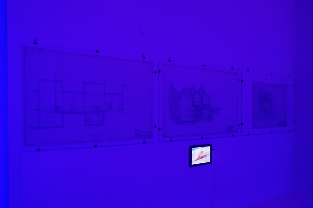 But the real highlight of the show for me came at the end, as I passed through a small hallway to reach the gallery’s dimly lit backroom — another instance of the show’s cruising-friendly design echoing its content. On the wall were blueprints for the members-only gay dance club The Saint, an ambitious addition to 1970s and 80s New York club design which the Cruising Pavilion curators describe as the “Teatro Olimpico of architecture’s sexual experiments… injecting poppers and LSD directly into the sensual production of space.” When the Saint opened in 1980, the club used these technical drawings of the redesigned building for its first invite, advertising the spatial appeal of a spectacular three-story “pleasure dome” and circular dance floor. Architect and co-owner Charles Terrell created the club’s fabulous design, which cost 13 million dollars when adjusted for inflation — one of the largest financial investments in the history of gay architectural space.