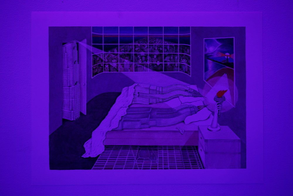 While the show referenced many projects for gay men that were actually built, the few lesbian spaces that were shown were never realized. The plans for one such project were originally published in the first issue of Out magazine in 1992: titled Lesbian Xanadu, the page layouts detailed the design for a tactile organic pleasure club developed by Amy Cappellazzo, Sarah Drake, Ann Krsul, and Alexis Roworth. Together they aimed to create a space that would challenge conventional capitalist class structures and gender norms. Patriarchal capitalism, in the form of the New York skyline, was the inspiration for two of the works on display: NYC Go-Go (Postcards from the Edge) (2014), a collage by Robert Getso, depicted a go-go boy scaled to skyscraper size dancing next to the Empire State building, the image queering the phallic tower’s association with straight-male ambition; it was complemented by Madelon Vriesendorp’s notorious 1975 Flagrant Délit showing the Empire State Building and Chrysler Building in bed together, with a third skyscraper breaking into the bedroom shining a flashlight on them, policing their behavior. Used on the cover of Rem Koolhaas’s Delirious New York, a book about how pleasure and decadence drove the city’s development, it was an image I’d seen countless times before. But it was only in the context of this exhibition that it became clear that these two skyscrapers are in fact intended to be read as a gay male couple, an epiphany that gave me newfound appreciation for Koolhaas and Vriesendorp’s famous tribute to the city that never sleeps.