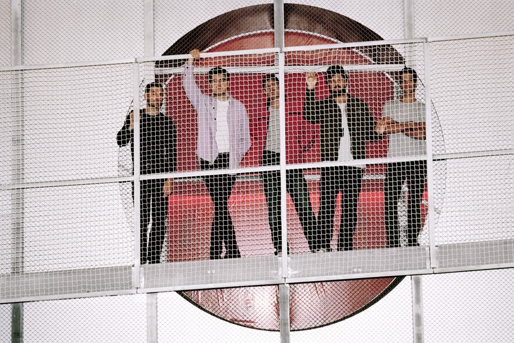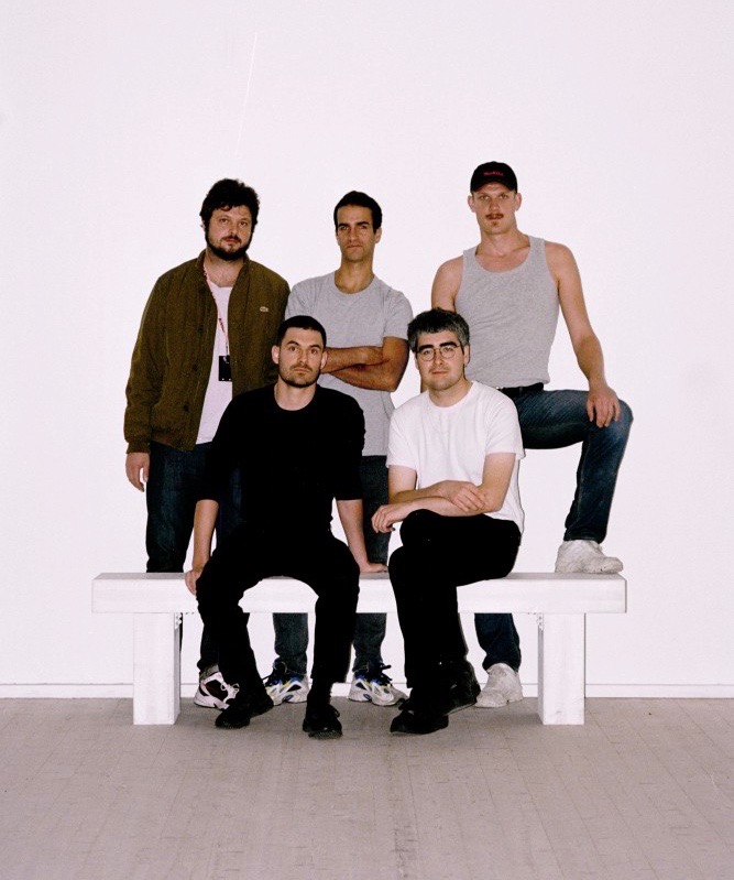 Cruising Pavilion curators Octave Perrault, James Taylor-Foster (ArkDes), Rasmus Myrup, Pierre-Alexandre Mateos, and Charles Teyssou photographed by Frida Vega Salomonsson in front of the Boxen exhibition space at ArkDes in Stockholm.