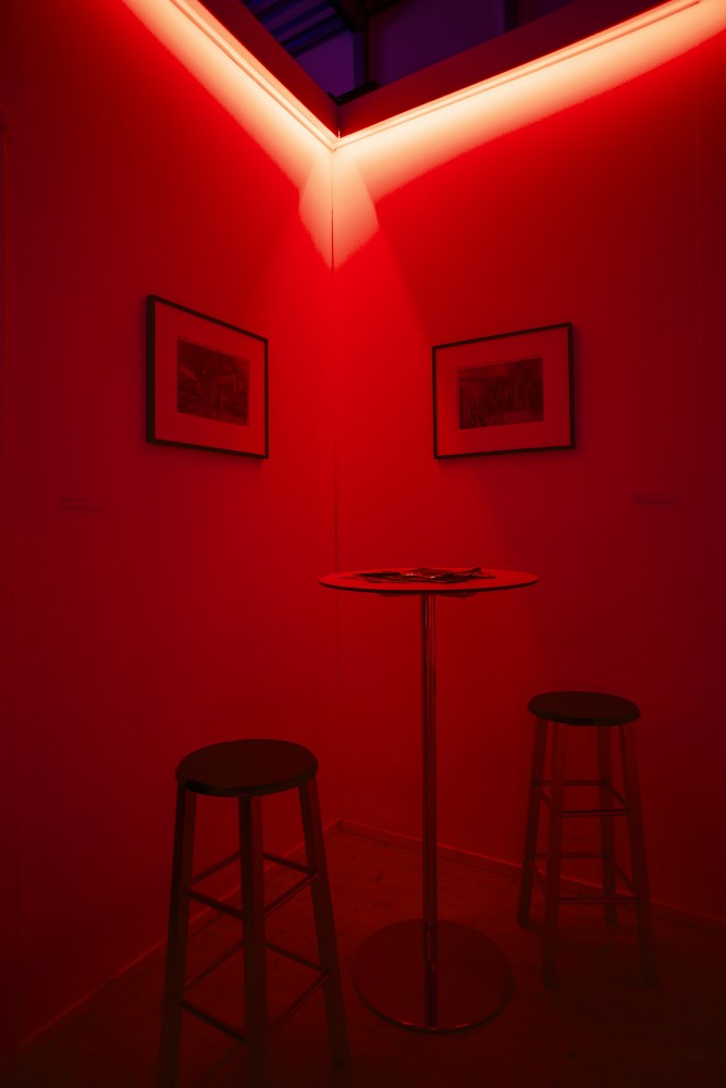 Inside Boxen, the Frankie Goes to Hollywood song “Welcome to the Pleasuredome” (part of a sound piece by artist Steven Warwick) set the tone for viewers to engage with the works, which were mostly drawn from the two previous exhibitions — although not everything was included, and there were new pieces not previously displayed in Venice or New York. In its Stockholm incarnation, Cruising Pavilion dropped the loose non-linear presentations of the past two shows in favor of a thematic organization, breaking the space into three distinct areas: the Bar, the Dark Room, and the Bedroom.